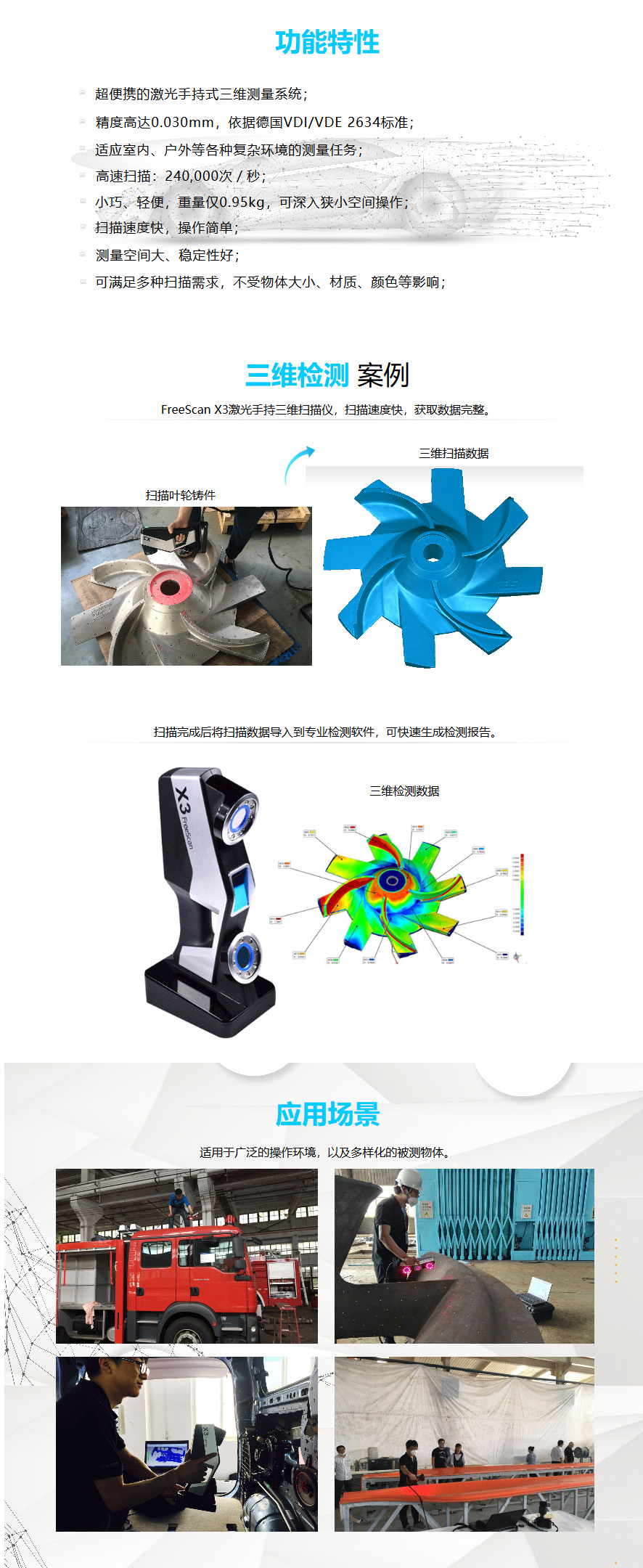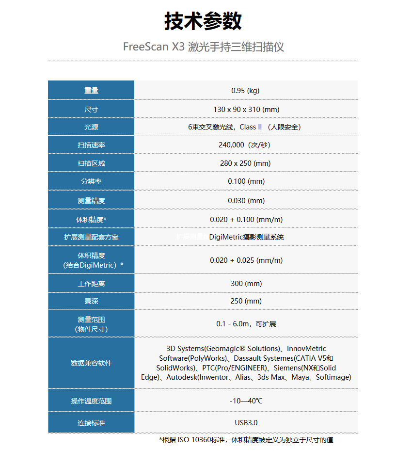 FreeScan X3激光手持三維掃描儀,設備重量僅有0.95kg,滿足當下用戶對于超便捷掃描儀的需求;全新線激光陣列3D掃描技術,掃描速率240,000 次/秒,掃描精度高達0.030mm,兼具快速與精準的雙重優勢。